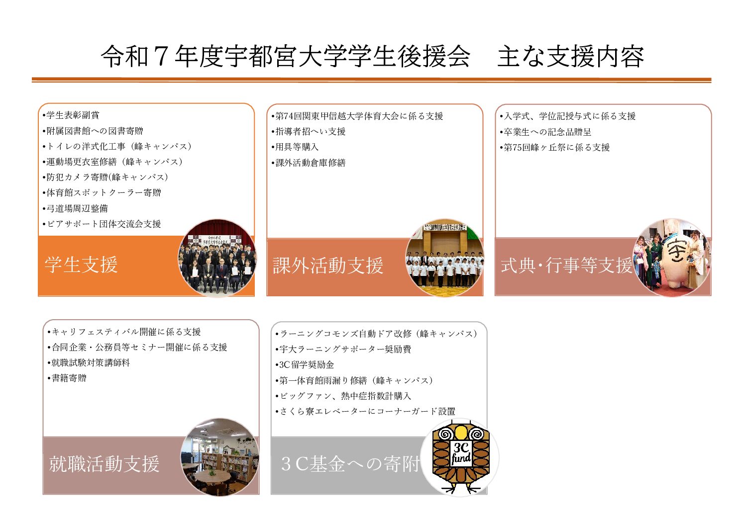 宇都宮大学学生後援会は、宇都宮大学に在籍する学生及び大学院生の学生生活、就職活動等の援助を目的とした学生支援組織です。